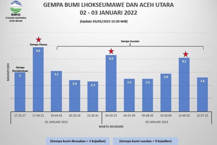 Andi menjelaskan, hingga Selasa (3/1) pukul 15.30 WIB, Stasiun Geofisika Aceh Besar mencatat telah terjadi gempa bumi susulan sebanyak 9 kejadian dengan kekuatan 2,3 magnitudo hingga 4,3 magnitudo. Di mana 3 kejadian gempa bumi dirasakan oleh masyarakat Lhokseumawe dan Aceh Utara.