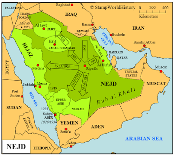 Mulailah Abdul Aziz II yang disokong oleh Inggris menyerang Riyadh dan Ha’il dan dapat merebutnya dari Klan Ibnu Ar-Rasyid yang disokong oleh Turki Utsmani. Sewaktu Perang Dunia I berkecamuk, Turki Utsmani menarik mundur angkatan bersenjatanya dari negeri Arab. Hal ini semakin mempermudah Dinasti Saudi untuk merebut wilayah-wilayah yang ada di Jazirah Arab.