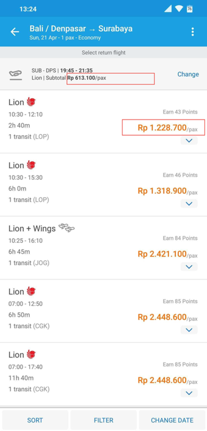 Total biaya pergi dan pulang dari Surabaya ke Bali menggunakan Lion Air dari Traveloka adalah Rp613.100 + Rp1.228.700 = Rp1.841.800
