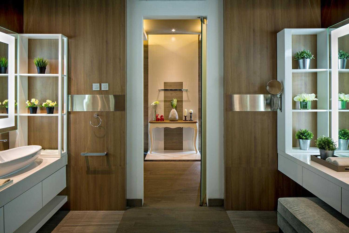 Apabila Anda sudah mantap dengan kebutuhan penyimpanan dalam kamar mandi, built-in shelves atau rak custom adalah pilihan yang tepat. Membuat rak permanen yang mengisi ceruk pada dinding adalah solusi yang cocok untuk memaksimalkan ruang yang tersedia. Rak ini tidak memakan banyak ruang. Anda bisa menyimpan peralatan mandi atau dekorasi lainnya seperti tanaman hias, bingkai, hingga lilin aromaterapi. Dekorasi rak dapat diserasikan dengan desain minimalis kamar mandi Anda.
