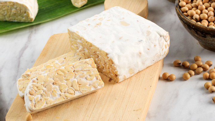 Tempe terbuat dari bahan kacang kedelai yang diolah menggunakan mikroorganisme Rhizopus Oryzae atau Rhizopus Oligosporus.