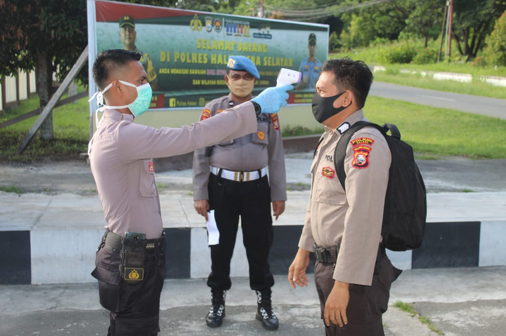 Kapolres Halsel AKBP M. Faishal Aris, S.I.K., M.M mengatakan, pemeriksaan suhu tubuh ini dilakukan untuk antisipasi penyebaran COVID-19 dilingkungan Polres Halsel.