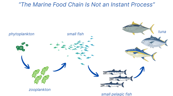 Secara ekologi, klorofil-a merefleksikan peningkatan produksi fitoplankton yang berlangsung relatif cepat. Akan tetapi, energi yang dihasilkan dari produksi primer tersebut tidak secara langsung tersedia bagi tuna. Transfer energi dalam ekosistem laut berlangsung secara bertahap melalui rantai makanan, dimulai dari fitoplankton, zooplankton, ikan pelagis kecil, hingga ikan pelagis menengah, sebelum akhirnya dimanfaatkan oleh tuna sebagai predator puncak. Proses ini menyebabkan adanya jeda waktu antara peningkatan klorofil-a dan respons kelimpahan tuna di suatu wilayah.