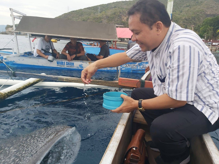"Bu Susi pernah berenang juga dengan hiu paus itu, Pak--saat beliau berkunjung ke sini," tambahnya menyakinkan.