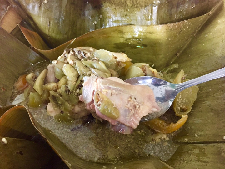 Setelah itu, ayam disiram kuah asam yang berasal dari belimbing wuluh atau asam jawa, sehingga rasanya segar dan sedikit asam. Ayam yang sudah dibumbui kemudian dibungkus menggunakan daun pisang dan dimasak dengan cara dikukus atau dikukus lalu dipanggang sampai matang dan harum.