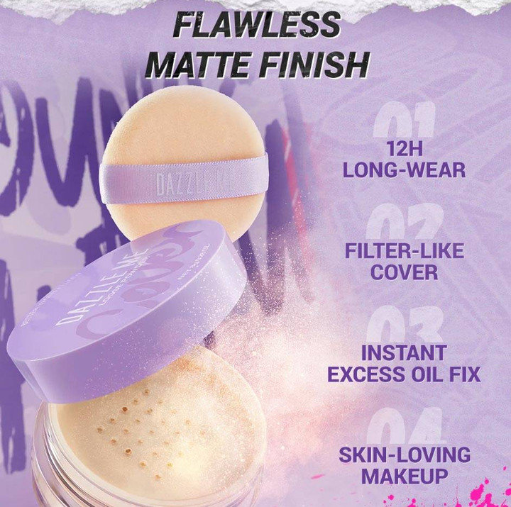 Rekomendasi bedak tabur untuk kulit berminyak salah satunya dari Dazzle Me.Info Produk