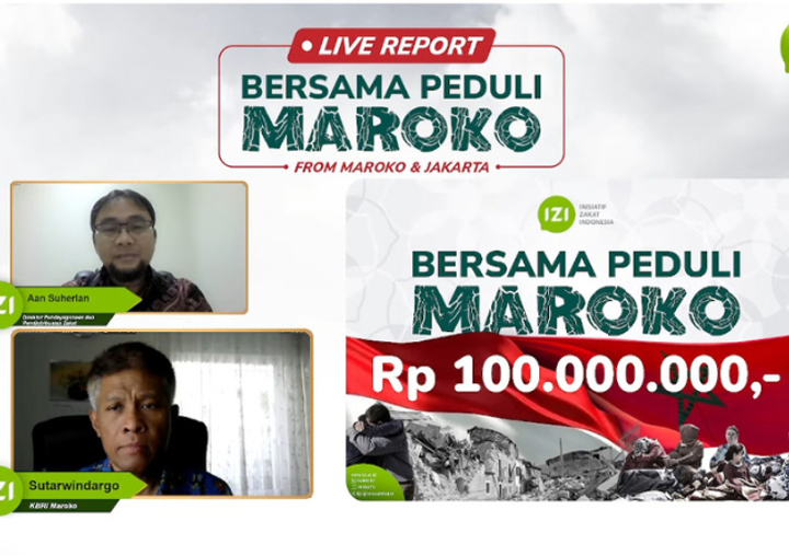 Jakarta – LAZNAS Inisiatif Zakat Indonesia menyalurkan donasi tahap 1 sebesar Rp. 100 Juta untuk para penyintas gempa di Maroko. Secara simbolis, penyaluran bantuan dilakukan oleh Direktur Pendayagunaan dan Pendistribusian Zakat (PPZ) LAZNAS IZI, Aan Suherlan kepada perwakilan KBRI Maroko, Sutarwindargo secara online dalam Live Report Bersama Peduli Maroko pada hari Jumat, 15 September 2023.