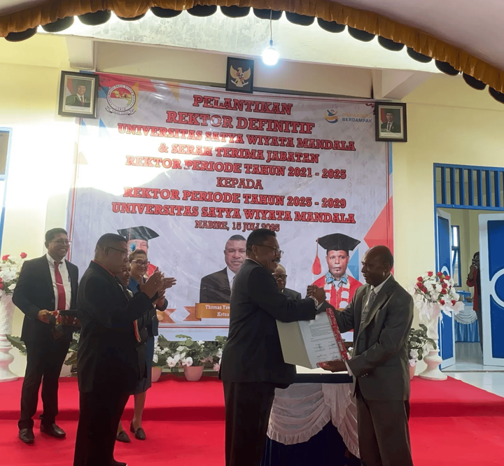 Pelantikan dan Pengukuhannya berdasarkan Surat Keputusan Yayasan Wiyata Cenderawasih Nabire Nomor: 002/SK-KET/YWC/7/2025 Tentang Pengangkatan Rektor Universitas Satya Wiyata Mandala Nabire.