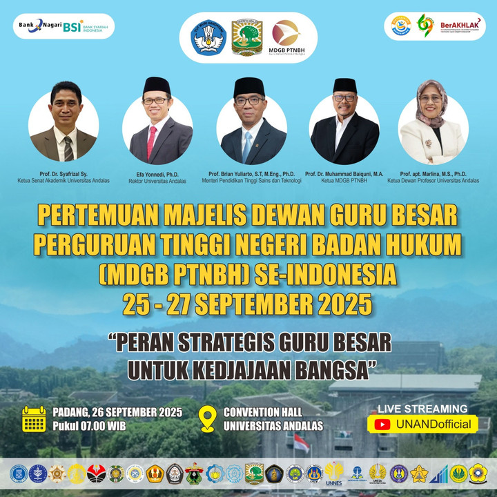 Universitas Andalas (UNAND) menjadi tuan rumah Pertemuan Majelis Dewan Guru Besar Perguruan Tinggi Negeri Badan Hukum (MDGB PTNBH) se-Indonesia yang digelar pada 25–27 September 2025 di Convention HalSEVIMA