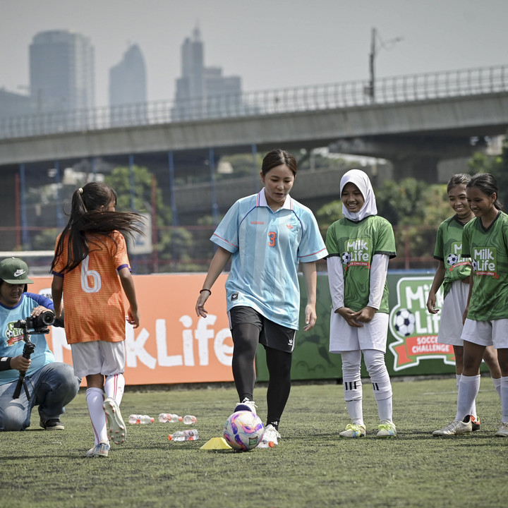Mana Iwabuchi dalam ajang Coaching Clinic MilkLife Soccer Challenge (MLSC) yang digelar di Pancoran Soccer Field, Jakarta.kumparanBOLANITA