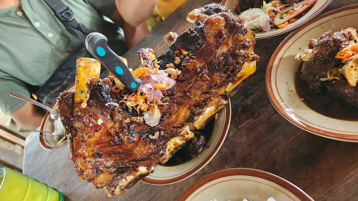 Setelah menunggu sekitar 20 menit akhirnya makanan pesanan kami datang. Mengejutkannya, seporsi balung dinosaurus bakar hadir begitu besar! Sejatinya hidangan ini adalah iga sapi bakar namun berukuran jumbo. Bahkan seporsi balung dinosaurus bakar ini bisa dimakan empat sampai lima orang.