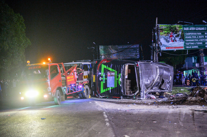 Bus rombongan perpisahan SMK Lingga Kencana Depok mengalami kecelakaan di Ciater, Subang, Jawa Barat, Sabtu (11/5). Bus itu mengangkut 52 orang, 10 di antaranya meninggal dunia dalam kecelakaan itu.
