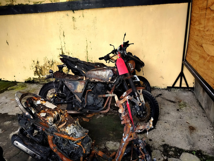 Api menjalar menghanguskan motor Honda Vario dan Yamaha Scoopy milik anak kos di rumah itu. Api juga membakar rumah 40 persen yang merupakan milik TW (56 tahun), kakak SN.