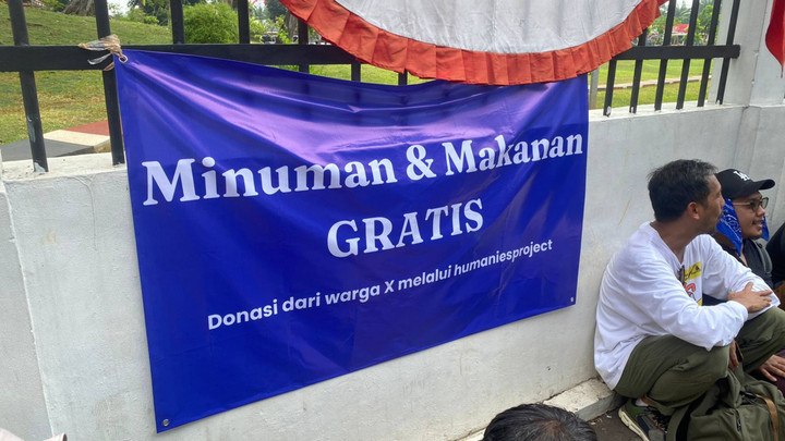 Mereka juga membentangkan spanduk bertuliskan "Minuman & makanan gratis. Donasi dari warga X melalui humaniesproject."