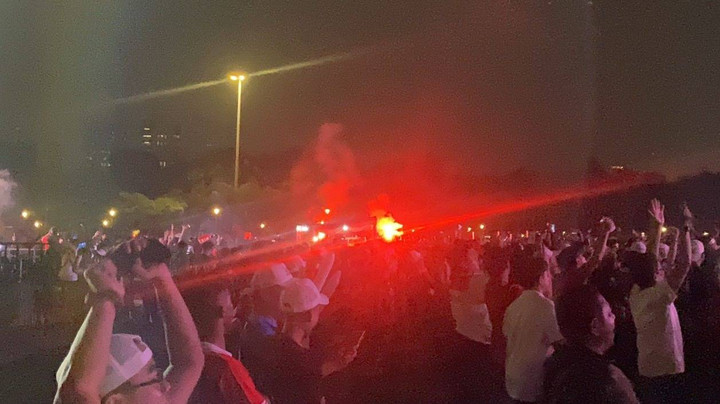 Tampak juga dari ujung pintu masuk nobar terlihat warga menyalakan flare berwarna merah. Asap tersebut diiringi dengan chant dari warga yang menonton.