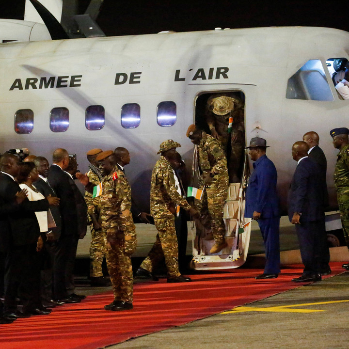 Dikutip dari Reuters, 46 tentara Pantai Gading yang baru-baru ini diampuni oleh junta Mali terbang pulang ke bandara Abidjan, Pantai Gading pada Sabtu (7/1).