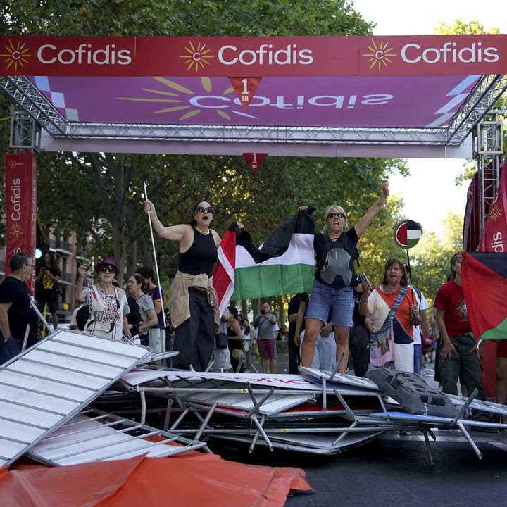 Di Gran Via, tempat para pesepeda harus menyelesaikan beberapa putaran, para pengunjuk rasa merobohkan pembatas jalan dan berbaris ke jalan, beberapa meneriakkan slogan-slogan boikot Israel sementara asap hijau dan merah memenuhi udara.