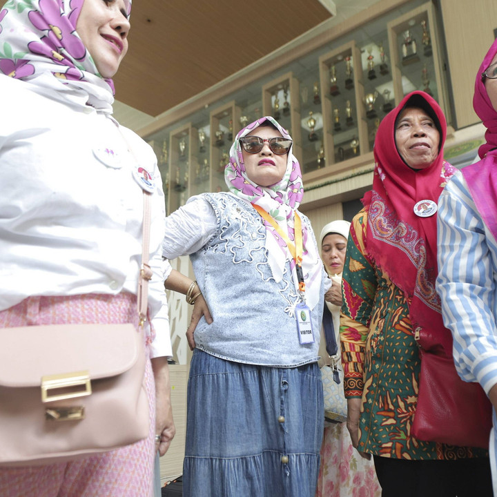 Tampak banyak emak-emak dengan kerudung bermotif bunga berwarna pink bersiap untuk mendukung jalannya sidang putusan praperadilan untuk Thomas Lembong.