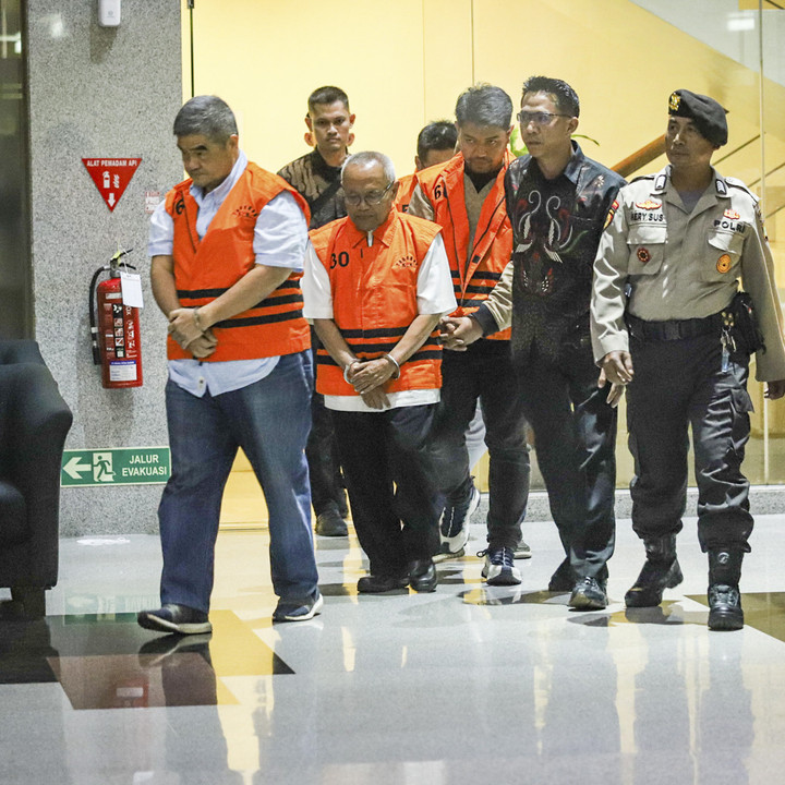 Dalam pantauan di Gedung KPK, kelima tersangka itu tampak turun dari ruang pemeriksaan sekitar pukul 19.13 WIB. Mereka tampak mengenakan rompi tahanan berwarna oranye dengan tangan terborgol.