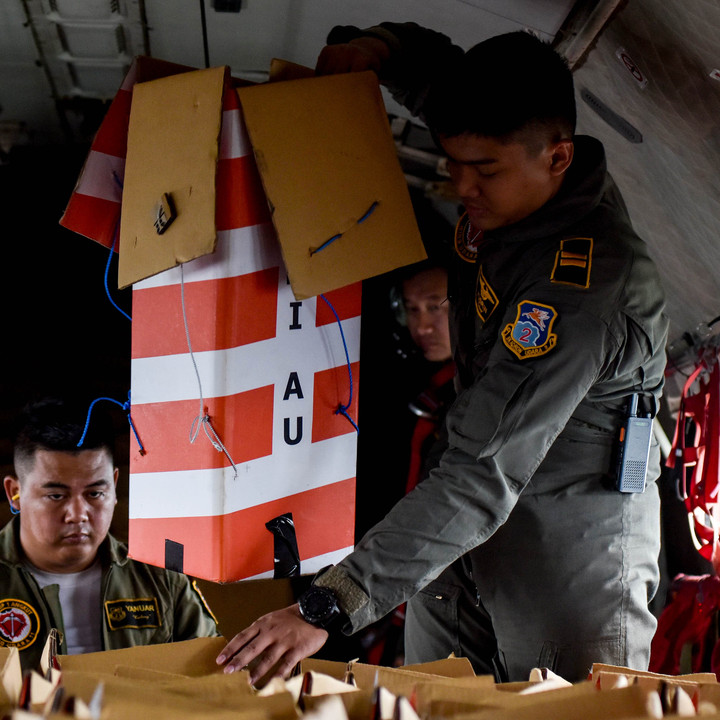 TNI AU mendistribusikan sebanyak 90 heli box bantuan berisi makanan untuk pengungsi bencana di wilayah Kabupaten Aceh Tamiang yang terisolir akibat bencana banjir.