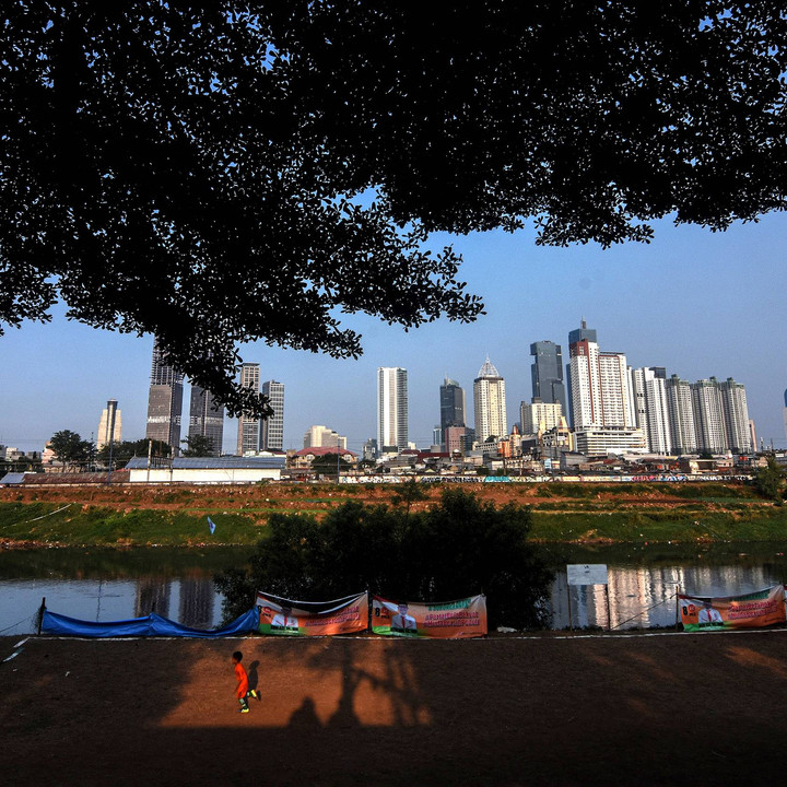 Aktivitas warga Petamburan di bantaran Banjir Kanal Baratdengan latar belakang gedung pencakar langit dikawasan Thamrin.kumparanNEWS