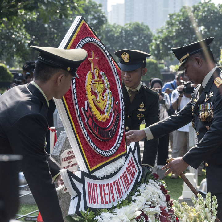 Ziarah nasional merupakan tradisi di TNI dalam menyambut HUT ke- Ke-79. Panglima TNI Jenderal TNI Agus Subiyanto didampingi KSAD Jenderal TNI Maruli Simanjuntak, KSAL Laksamana TNI Muhammad Ali dan dan KSAU Marsekal TNI Mohamad Tonny Harjono meletakkan karangan bunga di makam Presiden ke-3 RI BJ Habibie dan makam Wakil Presiden ke-4 RI Umar Wirahadikusumah.