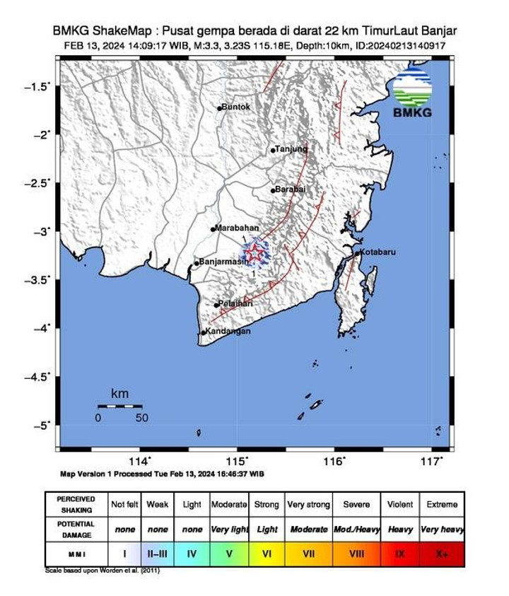 "Dengan memperhatikan lokasi episenter dan kedalaman hiposenternya, gempa bumi yang terjadi merupakan jenis gempa bumi dangkal akibat adanya aktivitas patahan Meratus," kata Kepala Pusat Gempa Bumi dan Tsunami BMKG Daryono dalam pernyataan tertulis, Selasa (13/2).