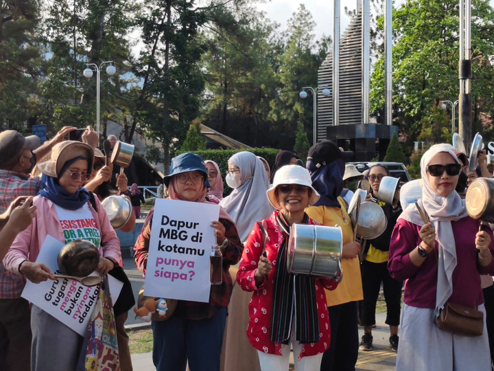 Sembari membunyikan panci dan alat dapur, mereka memprotes sejumlah kasus keracunan Makan Bergizi Gratis (MBG) di berbagai daerah.