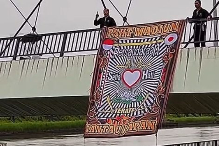 “Komunitas silat asal Madiun, PSHT Rantau Jepang, menjadi sorotan setelah membentangkan spanduk besar bertuliskan 'PSHT Madiun' di jembatan umum dekat sungai di Jepang. Aksi ini terekam video dan dinilai melanggar etika penggunaan ruang publik oleh warga setempat,” tulis akun tersebut.