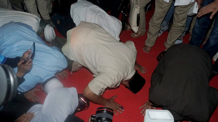 Tak lama kemudian, ia sujud syukur bersama sejumlah pendukungnya. Sebelumnya, ia sempat menanyakan arah kiblat ke guru spiritualnya, Ustaz Sambo.