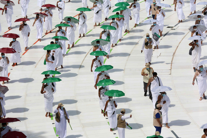 Pada musim haji 2020, lantai mataf ditempeli stiker warna-warni untuk menerapkan prokes jaga jarak. Jemaah melakukan tawaf dengan berdiri di jalur berstiker itu sehingga mereka memiliki jarak yang relatif jauh satu sama lainnya. Jemaah haji 2020 sebanyak seribu orang.
