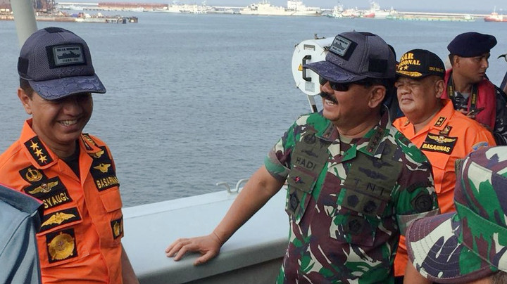 Panglima TNI Marsekal Hadi Tjahjanto dan Kabasarnas Marsekal Madya M Syaugi memeriksa langsung lokasi diduga ditemukan badan pesawat Lion Air JT-610. Objek diduga badan pesawat ini ditemukan oleh KRI Rigel-933.