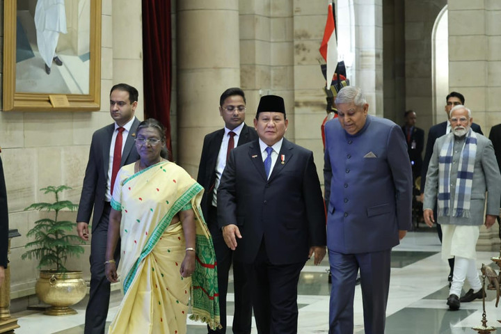 Presiden Republik Indonesia, Prabowo Subianto, menghadiri undangan jamuan santap malam kenegaraan yang digelar oleh Presiden India, Droupadi Murmu, di Istana Kepresidenan India, Rashtrapati Bhavan, pada Sabtu malam, 25 Januari 2025.