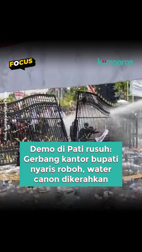 uasana demo di depan Kantor Bupati Pati, Rabu (13/8), memanas. Sekitar pukul 11.10 WIB, polisi menembakkan gas air mata dan menyemprotkan water cannon ke arah massa yang mencoba merobohkan dua gerbang kantor bupati.