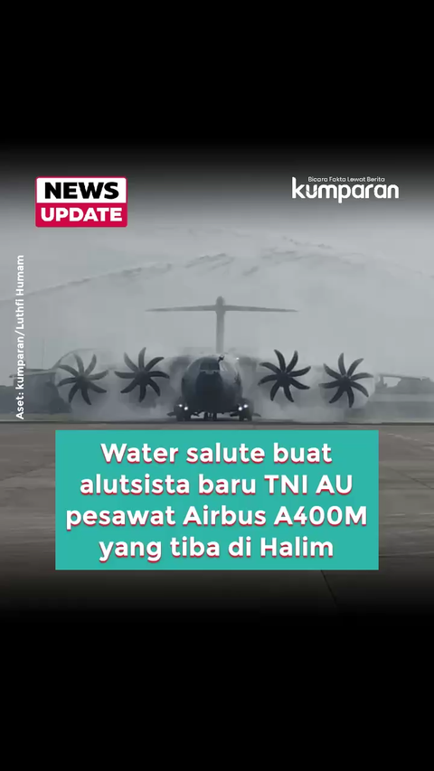 Pesawat Airbus A400M yang dibeli Indonesia akhirnya tiba di Base Ops Halim Perdanakusuma, Jakarta, pada Senin (3/11) sekitar pukul 07.50 WIB. Kedatangan pesawat berkelir abu-abu itu disambut meriah dengan tradisi water salute, di mana dua mobil water canon menyemprotkan air ke arah pesawat sebagai bentuk penghormatan.