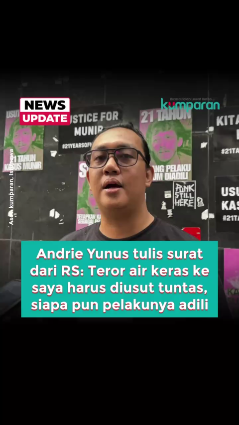 Wakil Koordinator Komisi untuk Orang Hilang dan Korban Tindak Kekerasan (KontraS), Andrie Yunus, mengirimkan surat terbuka dari ruang perawatan High Care Unit (HCU) RSCM terkait kasus penyiraman air keras yang menimpanya.