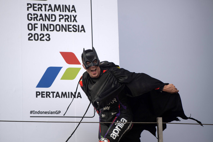Maverick Vinales finis kedua dalam balapan utama MotoGP Mandalika 2023 di Pertamina Mandalika International Circuit, NTB, pada Minggu (15/10). Pebalap Aprilia Racing itu lalu memakai kostum Batman saat berselebrasi di podium.