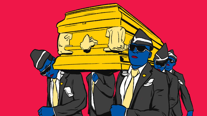 Ghana dancing palbearers viral di berbagai media sosial. Rombongan pembawa peti mati kemeja putih dengan jas hitam itu ramai banyak dijadikan meme.