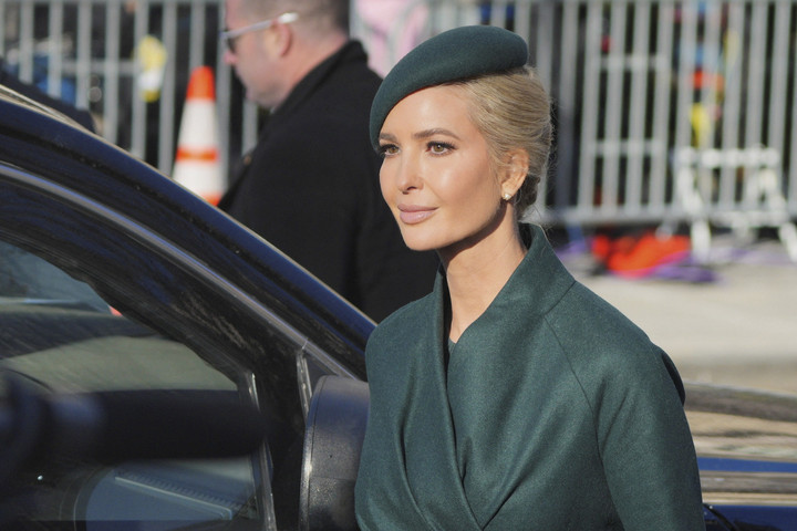 Ia mengenakan setelan blazer asimetris dan rok pensil. Busana tersebut ia padukan dengan topi model beret berwarna senada, sepatu heels hitam, serta tas Lady Dior. Rambut pirang Ivanka ditata dalam gelungan low bun rapi, memberikan kesan elegan pada penampilannya.