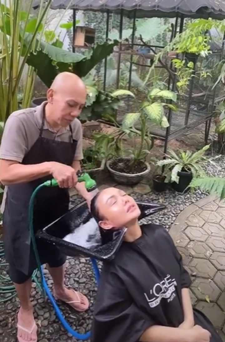 Dibantu oleh hairdresser, Yuni duduk layaknya sedang keramas di salon. Lengkap memakai penutup busana khas salon dan penadah air yang biasa dipakai mencuci rambut di salon.