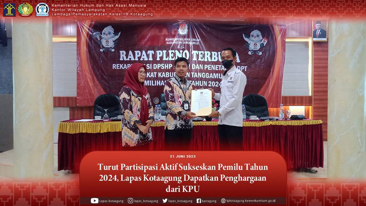 Partisipasi Aktif Sukseskan Pemilu 2024, Lapas Kotaagung Terima Penghargaan KPU