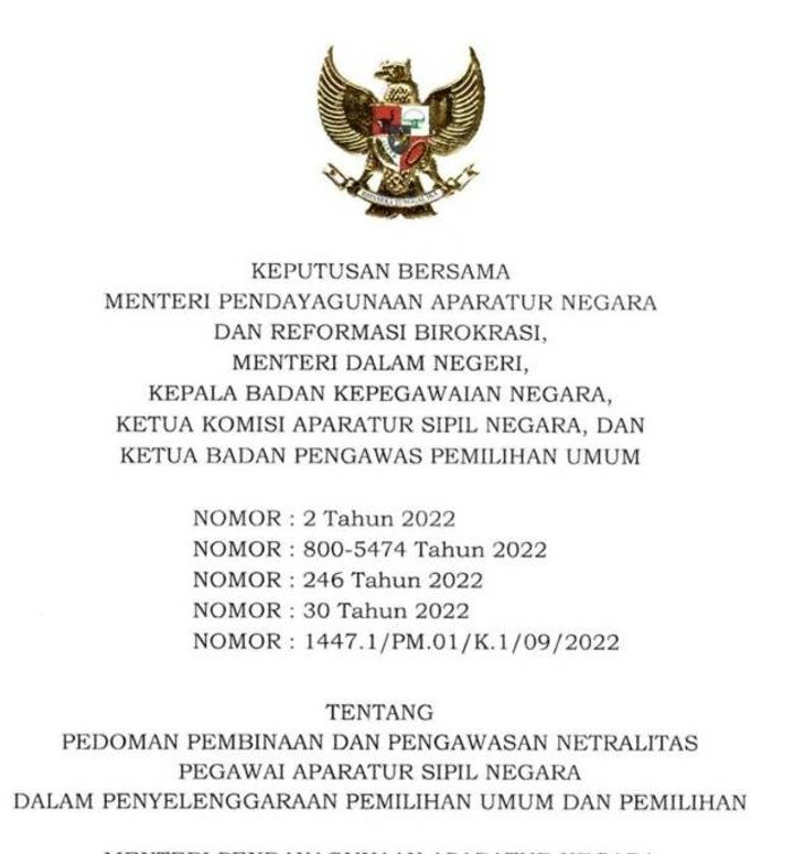 SKB 5 Lembaga Negara tersebut memuat lima ruang lingkup yakni pembinaan dan pengawasan, pelanggaran dan penjatuhan sanksi, pembentukan satuan tugas, tata cara penanganan laporan pelanggaran, dan terakhir terkait monitoring dan evaluasi. Kelima ruang lingkup inilah berhubungan dengan netralitas ASN pada penyelenggaran pemilu mendatang.