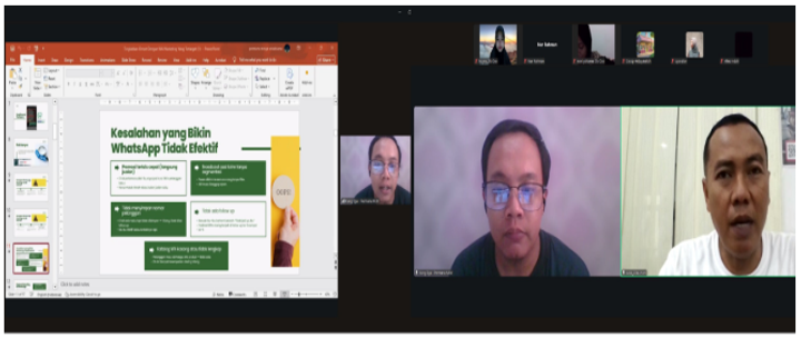 Webinar ini bertujuan memberikan panduan praktis bagi pelaku UMKM dalam mengelola pemasaran digital secara efektif, mulai dari cara membangun kepercayaan melalui WhatsApp, teknik pesan yang menarik, penggunaan fitur WhatsApp Business, hingga penyusunan strategi follow-up yang mendorong peningkatan konversi penjualan. Upaya ini sekaligus mendukung pentingnya peningkatan produktivitas dan kapasitas UMKM guna menghadapi persaingan ekonomi digital yang semakin dinamis.