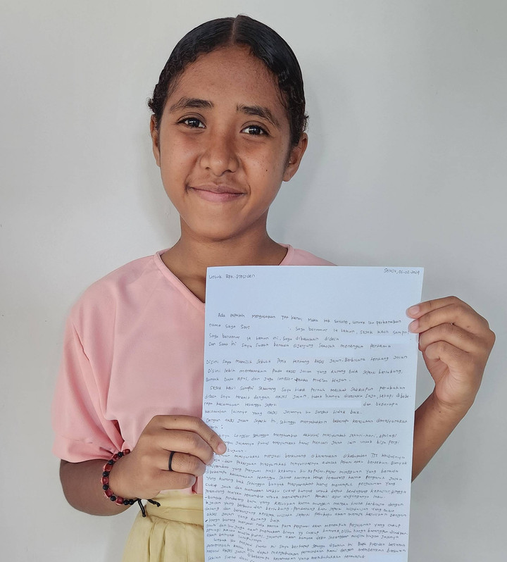 Sari, 14 tahun, menuliskan surat bagi Bapak Presiden untuk memberikan akses infrastruktur yang lebih baik di desanya.Plan Indonesia