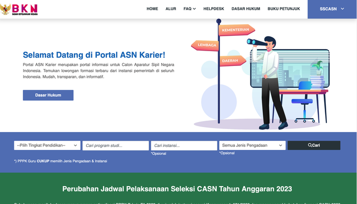 Pada tahap awal, pendaftar diharuskan mengisi pendidikan yang sesuai, lalu Adnya cari program studi, dan cari instansi yang ingin dituju. Lalu, nanti portal tersebut akan memberikan informasi formasi-formasi apa saja yang dibuka pada penerimaan CPNS tahun ini. Walaupun antusiasme masyarakat lebih tertuju pada penerimaan CPNS, tetapi sebenarnya PPPK pun memberikan kesempatan yang baik kepada warga negara Indonesia. Menurut informasi yang dihimpun dari laman portal SSCASN, jadwal pelaksanaan optimalisasi PPPK TA 2022 di sejumlah instansi sesuai Kepmenpanrb 571/2023 dan proses verval kebutuhan formasi CASN 2023 di masing-masing instansi, Panselnas melalui BKN menjadwalkan ulang pembukaan pendaftaran seleksi CASN 2023. Namun, tenang saja, karena beberapa formasi dan instansi telah tersedia di laman tersebut.