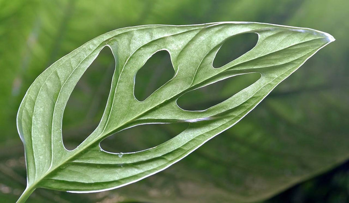 Daun janda bolong cenderung lebih memanjang dan berlubang secara alami dengan bentuk yang tidak beraturan.
