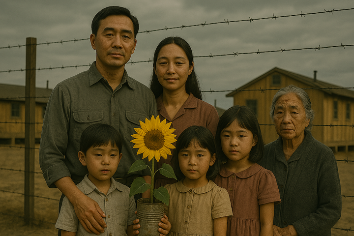 Cerita ini merupakan karya fiksi yang ditulis dengan latar belakang peristiwa sejarah nyata, yaitu interniran warga keturunan Jepang di Amerika Serikat selama Perang Dunia II. Nama, tokoh, dan sebagian kejadian dalam cerita ini adalah hasil imajinasi penulis dan tidak dimaksudkan untuk menggambarkan individu atau keluarga tertentu secara nyata.