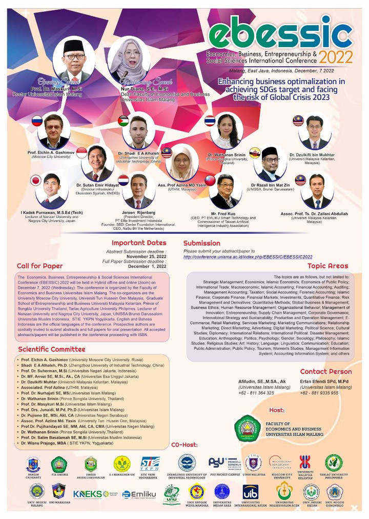 Sebagai narahubung dalam acara EBESSIC ini yaitu Afifudin SE, M.SA., Ak. selaku Wakil Dekan 1 FEB UNISMA dan Erfan Efendi, SPd, MPd selaku ketua International Development Division (IDD) FEB UNISMA.