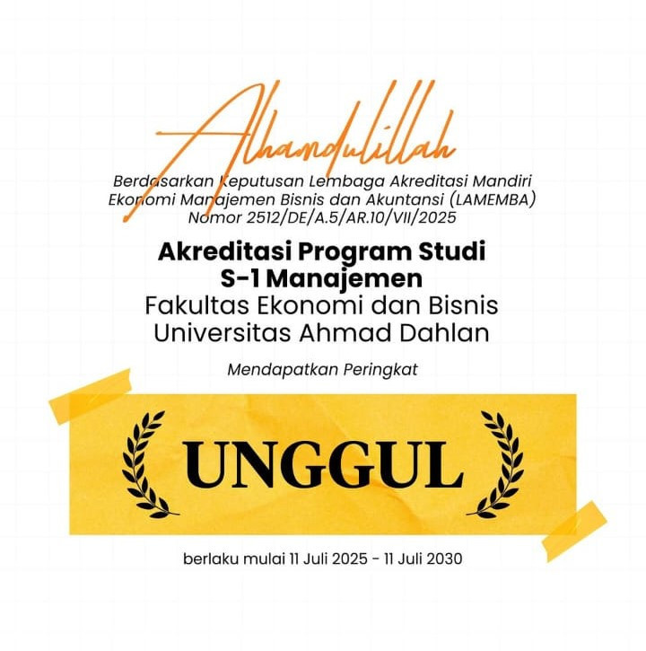 Universitas Ahmad Dahlan (UAD) kembali menorehkan prestasi membanggakan melalui Program Studi S-1 Manajemen, Fakultas Ekonomi dan Bisnis (FEB), yang berhasil meraih peringkat Akreditasi Unggul. Penetapan ini berdasarkan keputusan Lembaga Akreditasi Mandiri Ekonomi Manajemen Bisnis dan Akuntansi (LAMEMBA) dengan nomor 2508/DE/A.5/AR.10/VII/2025, berlaku mulai 11 Juli 2025 hingga 11 Juli 2030.