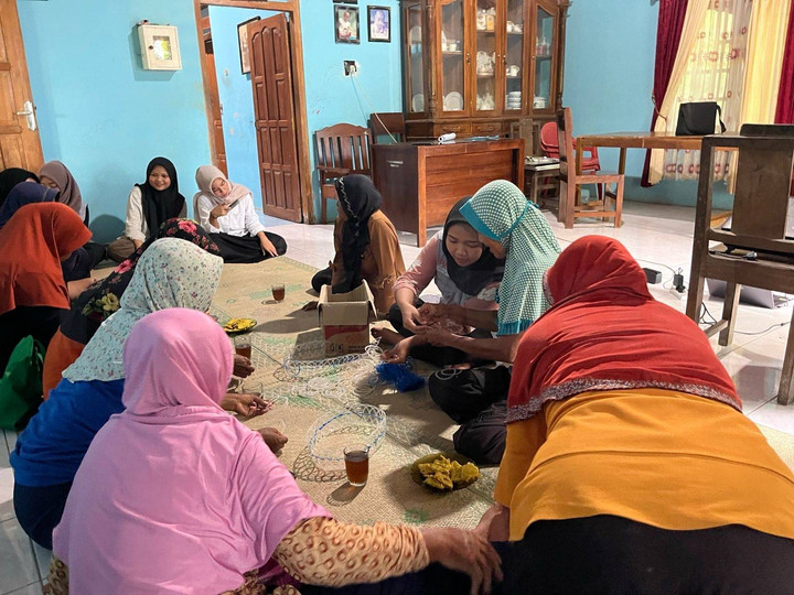 Mahasiswa Kuliah Kerja Nyata (KKN) Reguler Program Kerja Keilmuan Ekonomi Pembangunan XVI.A.I Universitas Ahmad Dahlan (UAD) melakukan pembuatan kerajinan tangan dari bahan limbah kemasan gelas plastik di Dusun Semawung, Desa Banjarharjo, Kecamatan Kalibawang, Kulon Progo, pada Senin, 12-2-2024.